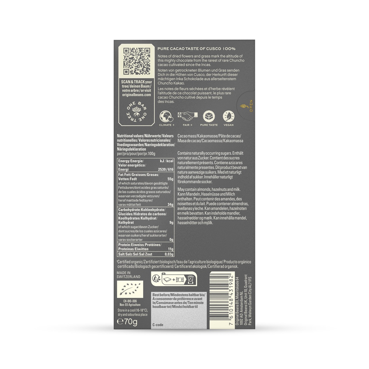 Notas de flores secas y hierba marcan la altitud de este imponente cacao, proveniente del excepcional cacao Chuncho, cultivado desde la época inca.